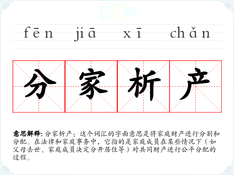 分家析产:这个词汇的字面意思是将家庭财产进行分割和分配。在法律和家庭事务中,它指的是家庭成员在某些情况下(如父母去世、家庭成员决定分开居住等)对共同财产进行公平分配的过程。