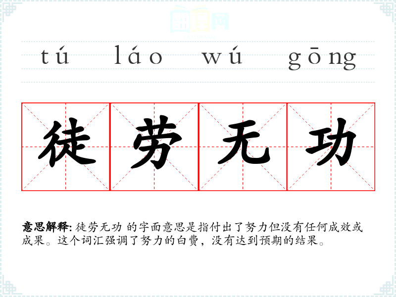 徒劳无功 的字面意思是指付出了努力但没有任何成效或成果。这个词汇强调了努力的白费,没有达到预期的结果。