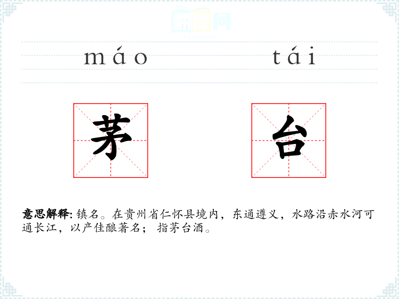 镇名。在贵州省仁怀县境内,东通遵义,水路沿赤水河可通长江,以产佳酿著名; 指茅台酒。