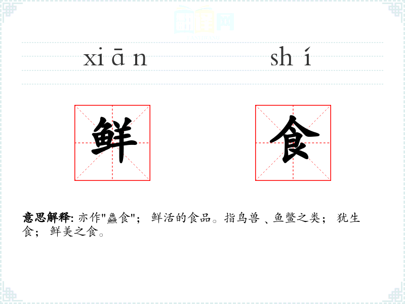 亦作"鱻食"; 鲜活的食品。指鸟兽﹑鱼鳖之类; 犹生食; 鲜美之食。