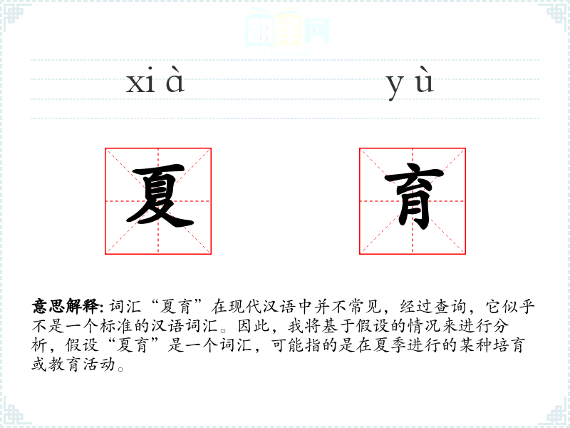 词汇“夏育”在现代汉语中并不常见,经过查询,它似乎不是一个标准的汉语词汇。因此,我将基于假设的情况来进行分析,假设“夏育”是一个词汇,可能指的是在夏季进行的某种培育或教育活动。