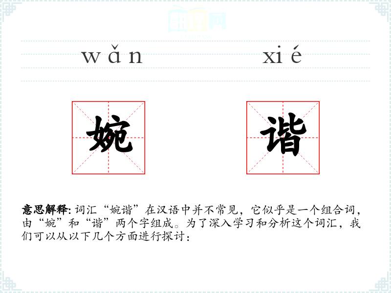 词汇“婉谐”在汉语中并不常见,它似乎是一个组合词,由“婉”和“谐”两个字组成。为了深入学习和分析这个词汇,我们可以从以下几个方面进行探讨: