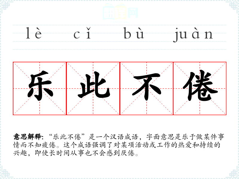 “乐此不倦”是一个汉语成语,字面意思是乐于做某件事情而不知疲倦。这个成语强调了对某项活动或工作的热爱和持续的兴趣,即使长时间从事也不会感到厌倦。