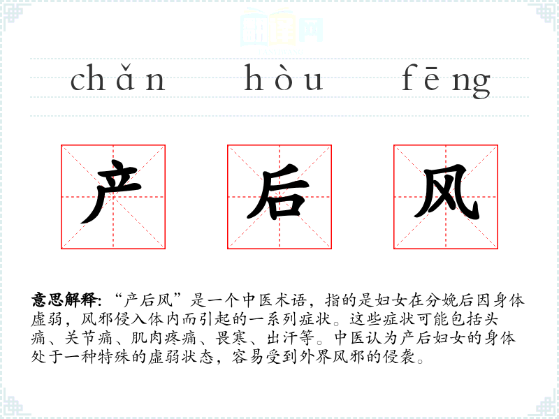 “产后风”这个词汇源自中医理论,其中“产后”指的是分娩后的时期,“风”在中医中指的是一种外邪,可以引起各种病症。这个词汇在中医文献中有着悠久的历史,其含义和用法相对稳定。