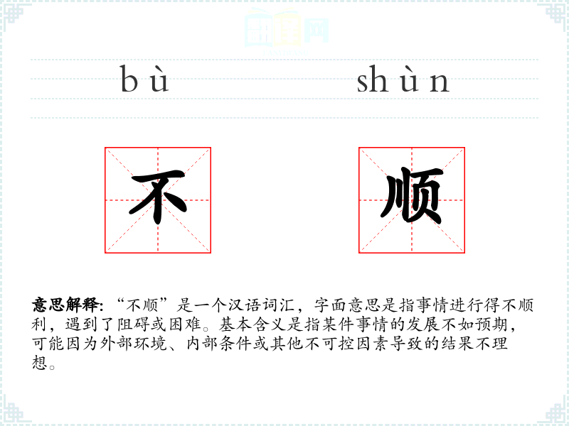 “不顺”是一个汉语词汇,字面意思是指事情进行得不顺利,遇到了阻碍或困难。基本含义是指某件事情的发展不如预期,可能因为外部环境、内部条件或其他不可控因素导致的结果不理想。