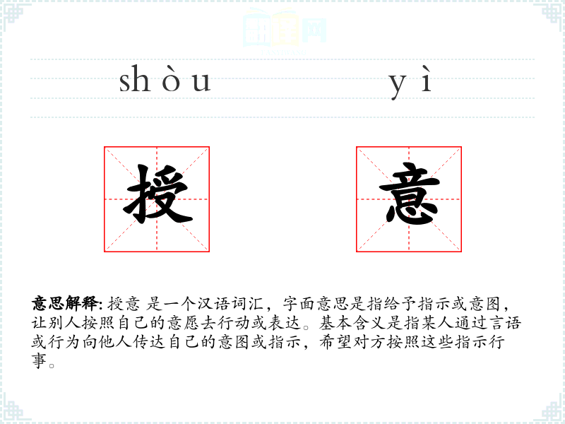授意 是一个汉语词汇,字面意思是指给予指示或意图,让别人按照自己的意愿去行动或表达。基本含义是指某人通过言语或行为向他人传达自己的意图或指示,希望对方按照这些指示行事。
