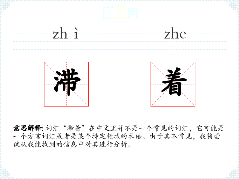 词汇“滞着”在中文里并不是一个常见的词汇,它可能是一个方言词汇或者是某个特定领域的术语。由于其不常见,我将尝试从我能找到的信息中对其进行分析。
