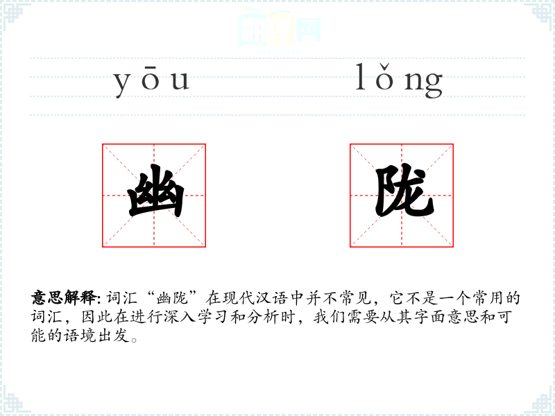 词汇“幽陇”在现代汉语中并不常见,它不是一个常用的词汇,因此在进行深入学*和分析时,我们需要从其字面意思和可能的语境出发。