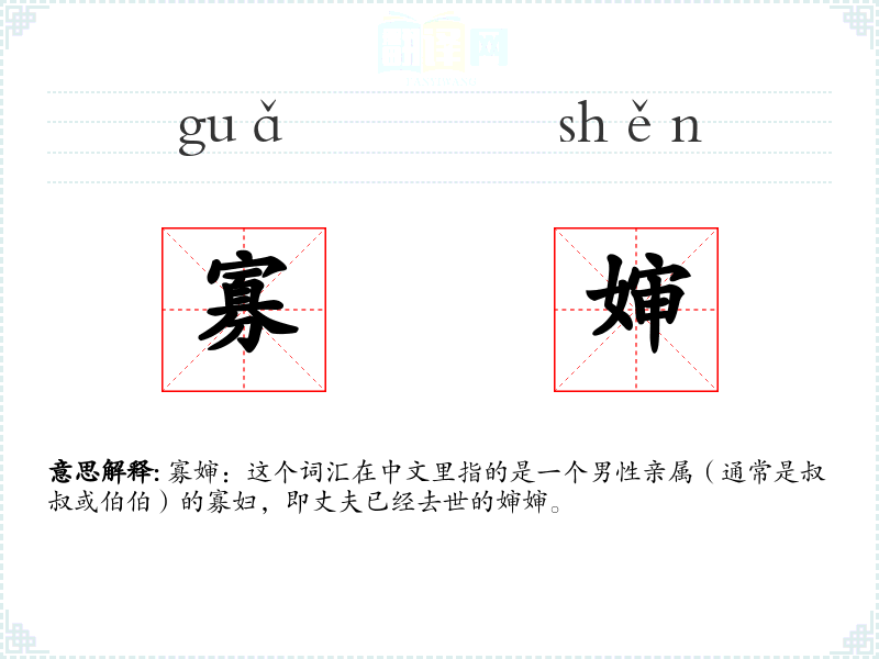 寡婶:这个词汇在中文里指的是一个男性亲属(通常是叔叔或伯伯)的寡妇,即丈夫已经去世的婶婶。