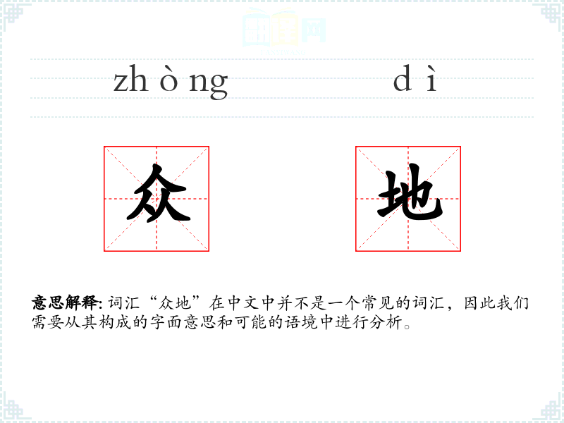 词汇“众地”在中文中并不是一个常见的词汇,因此我们需要从其构成的字面意思和可能的语境中进行分析。