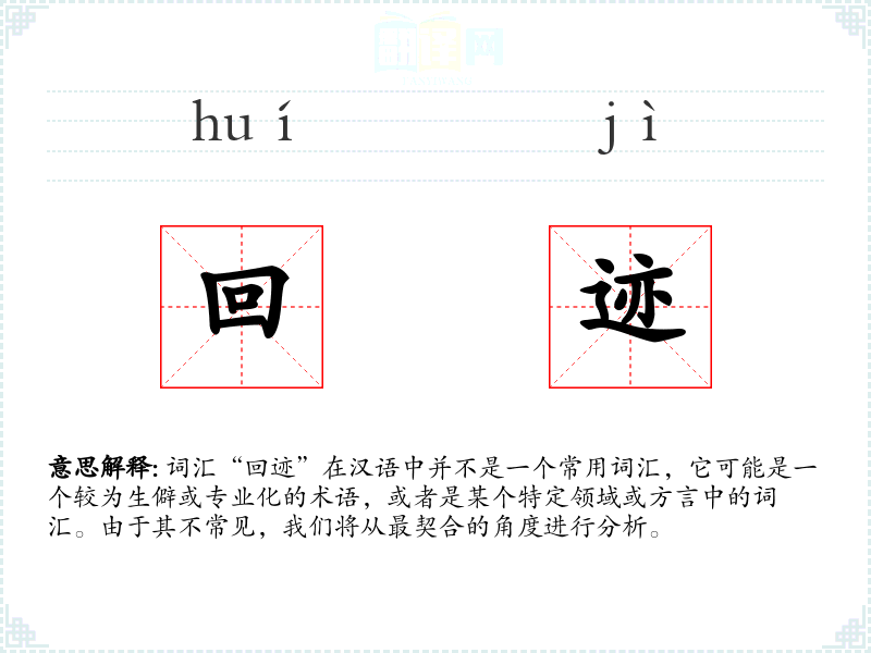 - 反义词:无(由于“回迹”不常用,反义词可能不明显)