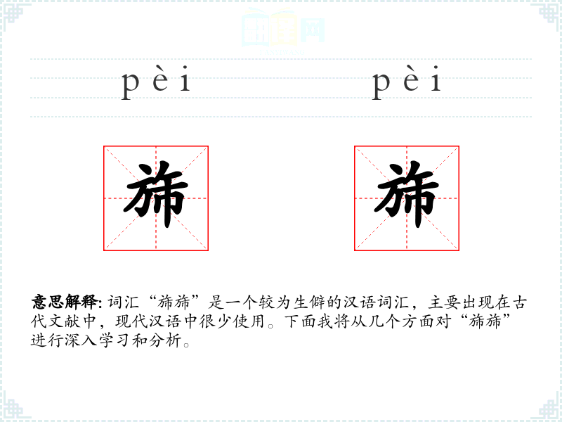 词汇“旆旆”是一个较为生僻的汉语词汇,主要出现在古代文献中,现代汉语中很少使用。下面我将从几个方面对“旆旆”进行深入学*和分析。