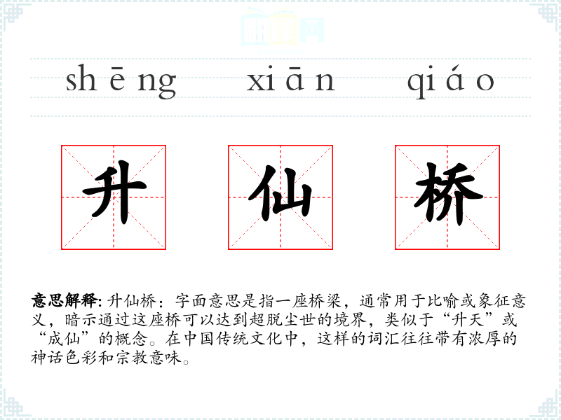 升仙桥:字面意思是指一座桥梁,通常用于比喻或象征意义,暗示通过这座桥可以达到超脱尘世的境界,类似于“升天”或“成仙”的概念。在传统文化中,这样的词汇往往带有浓厚的神话色彩和意味。