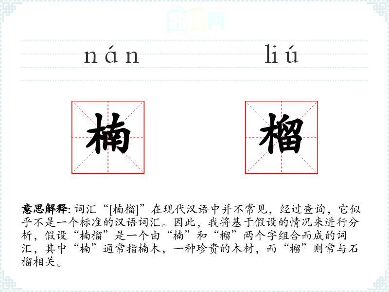 - 楠榴:假设这是一个复合词,可能指的是一种与楠木和石榴有关的物品或概念,具体含义需要进一步的语境来确定。