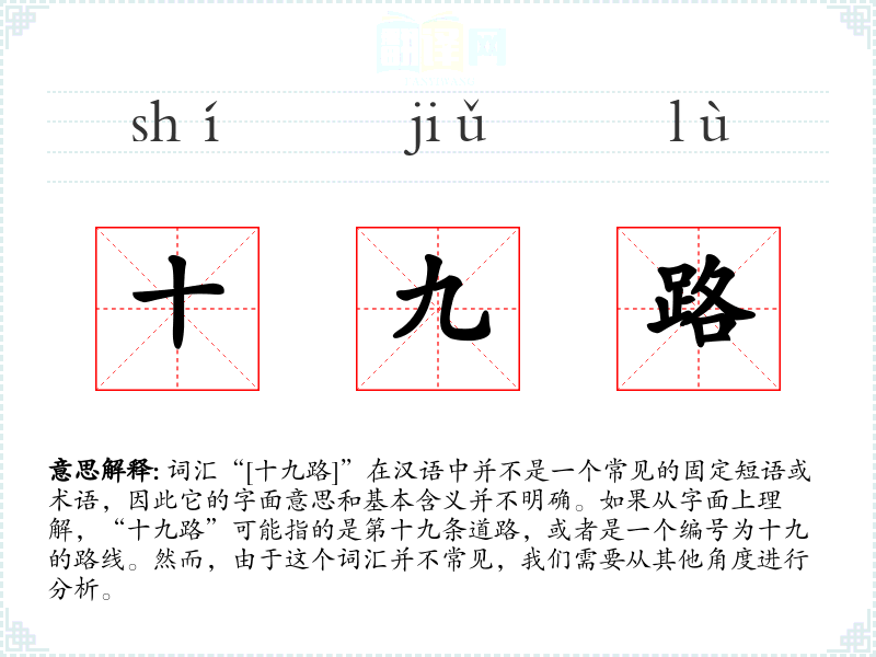 词汇“[十九路]”在汉语中并不是一个常见的固定短语或术语,因此它的字面意思和基本含义并不明确。如果从字面上理解,“十九路”可能指的是第十九条道路,或者是一个编号为十九的路线。然而,由于这个词汇并不常见,我们需要从其他角度进行分析。