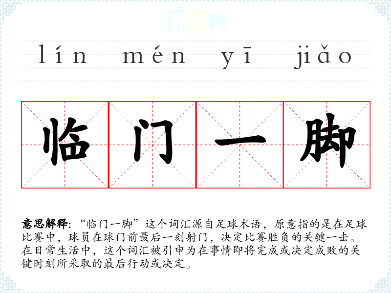 “临门一脚”这个词汇源自足球术语,原意指的是在足球比赛中,球员在球门前最后一刻射门,决定比赛胜负的关键一击。在日常生活中,这个词汇被引申为在事情即将完成或决定成败的关键时刻所采取的最后行动或决定。