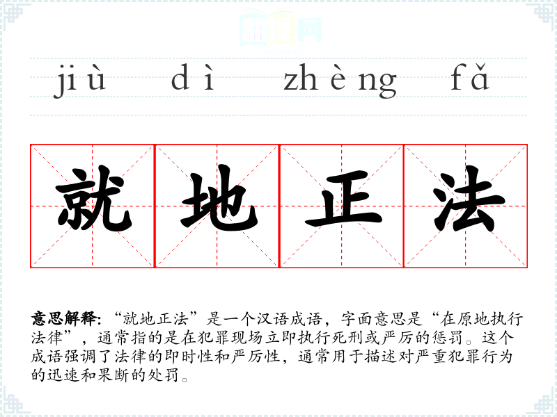 “就地正法”是一个汉语成语,字面意思是“在原地执行法律”,通常指的是在犯罪现场立即执行死刑或严厉的惩罚。这个成语强调了法律的即时性和严厉性,通常用于描述对严重犯罪行为的迅速和果断的处罚。