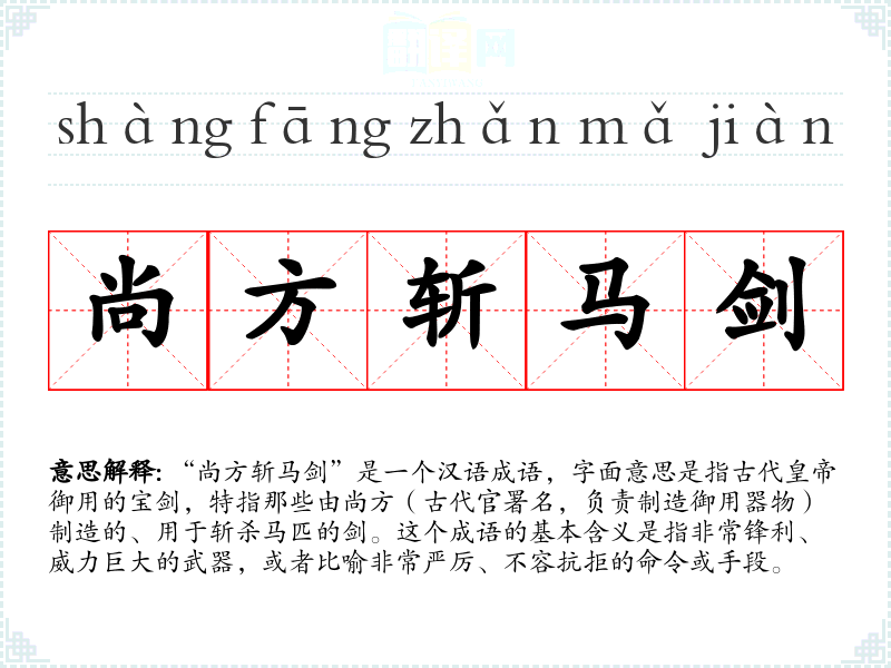“尚方斩马剑”是一个汉语成语,字面意思是指古代**御用的宝剑,特指那些由尚方(古代官署名,负责制造御用器物)制造的、用于斩杀马匹的剑。这个成语的基本含义是指非常锋利、威力巨大的武器,或者比喻非常严厉、不容抗拒的命令或手段。