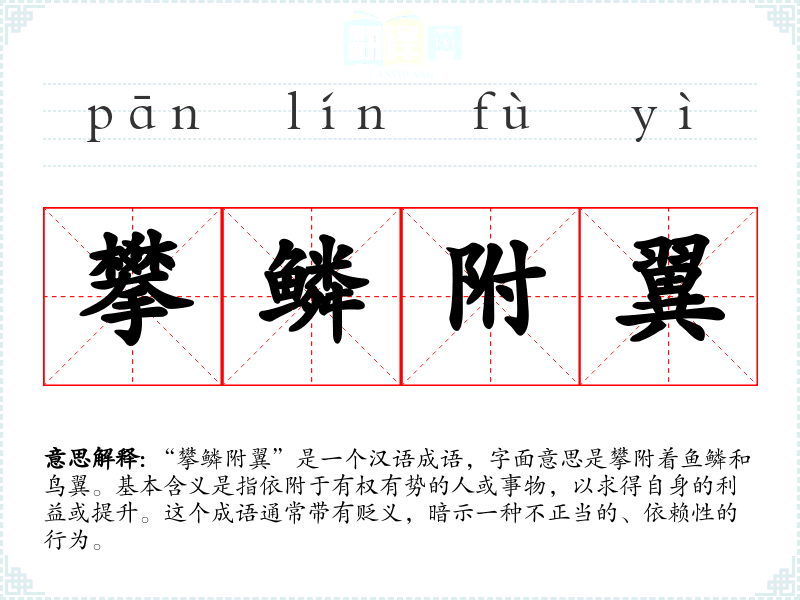 “攀鳞附翼”是一个汉语成语,字面意思是攀附着鱼鳞和鸟翼。基本含义是指依附于有权有势的人或事物,以求得自身的利益或提升。这个成语通常带有贬义,暗示一种不正当的、依赖性的行为。