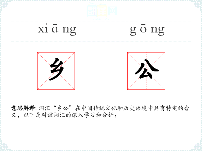 词汇“乡公”在*传统文化和历史语境中具有特定的含义,以下是对该词汇的深入学和分析: