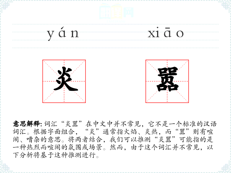 由于“炎嚣”不是一个常用词汇,其词源和演变不详。可能是由“炎”和“嚣”两个字组合而成,用以形容特定的氛围或场景。