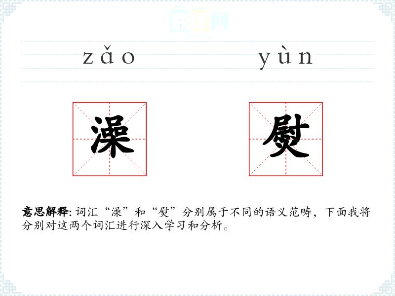 词汇“澡”和“熨”分别属于不同的语义范畴,下面我将分别对这两个词汇进行深入学习和分析。