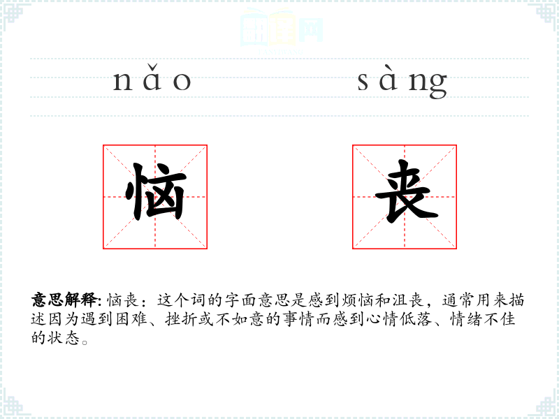 恼丧:这个词的字面意思是感到烦恼和沮丧,通常用来描述因为遇到困难、挫折或不如意的事情而感到心情低落、情绪不佳的状态。