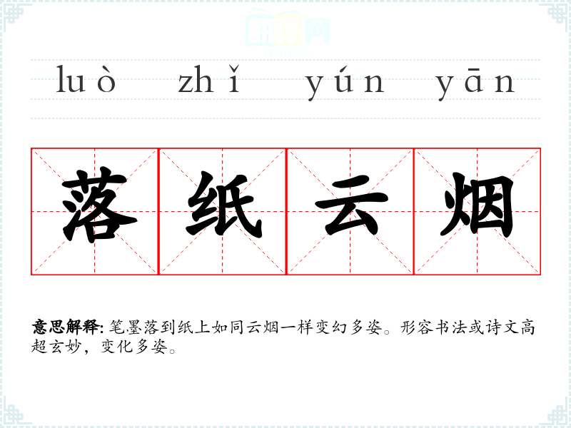 笔墨落到纸上如同云烟一样变幻多姿。形容书法或诗文高超玄妙,变化多姿。