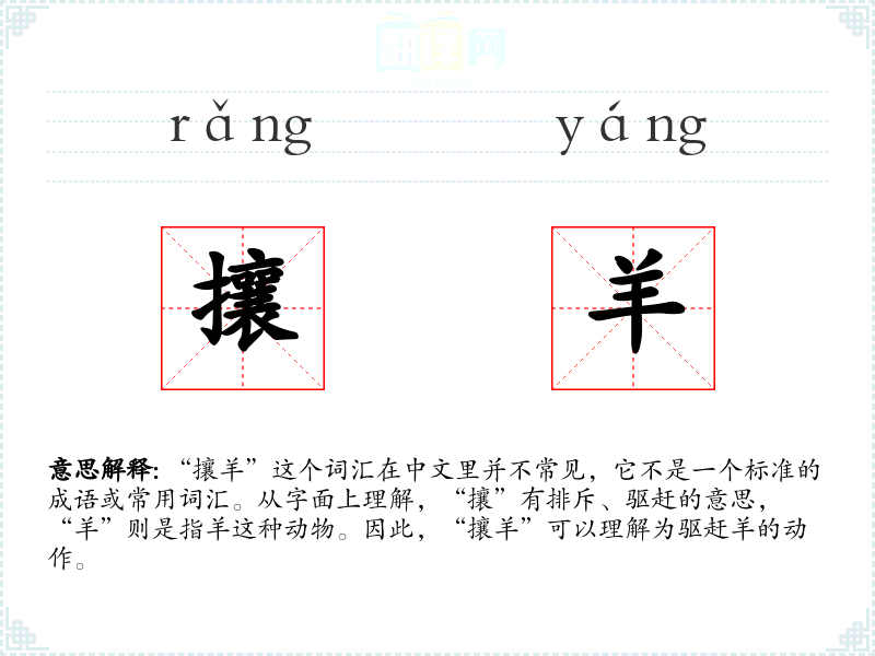 由于“攘羊”不是一个常用词汇,它在不同的语境下可能没有特定的使用方式。在文学作品中,如果出现“攘羊”,可能是指具体的驱赶羊的动作,或者象征性地表示驱赶或排斥某种事物。