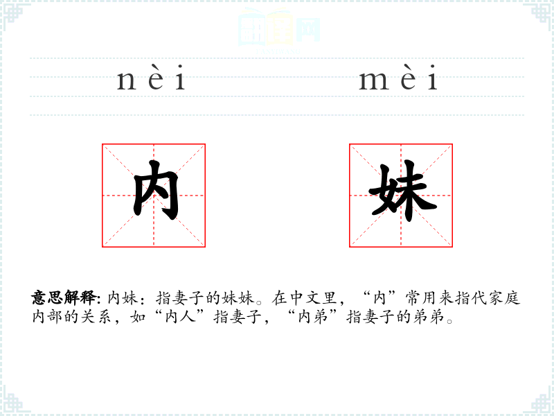 内妹:指妻子的妹妹。在中文里,“内”常用来指代家庭内部的关系,如“内人”指妻子,“内弟”指妻子的弟弟。