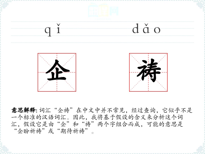 词汇“企祷”在中文中并不常见,经过查询,它似乎不是一个标准的汉语词汇。因此,我将基于假设的含义来分析这个词汇,假设它是由“企”和“祷”两个字组合而成,可能的意思是“企盼祈祷”或“期待祈祷”。