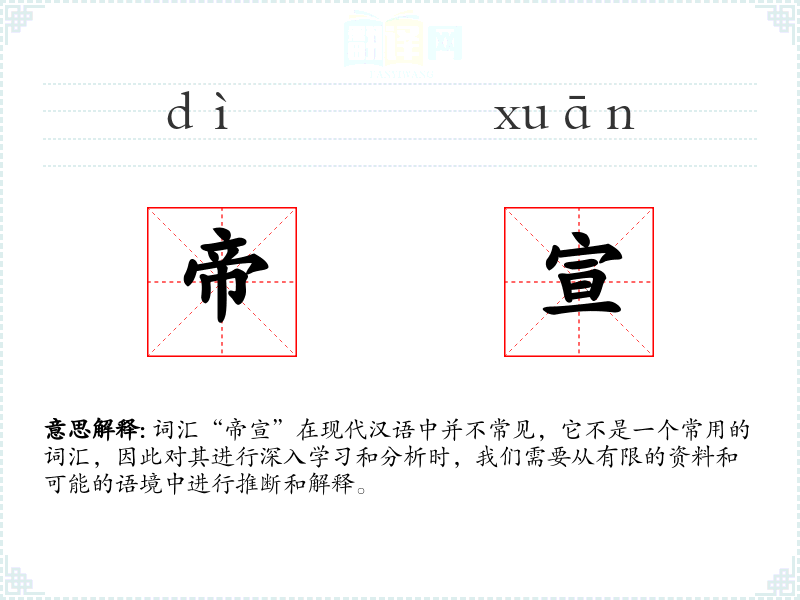 词汇“帝宣”在现代汉语中并不常见,它不是一个常用的词汇,因此对其进行深入学*和分析时,我们需要从有限的资料和可能的语境中进行推断和解释。