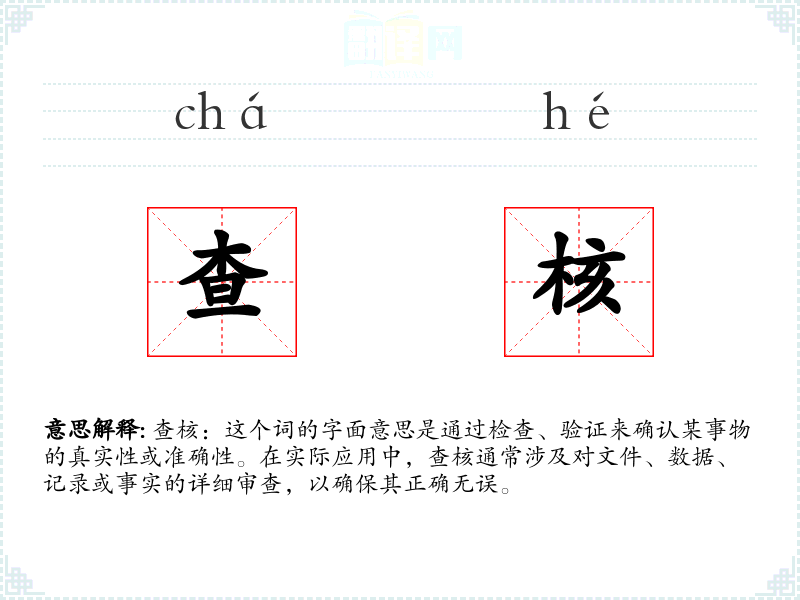 查核:这个词的字面意思是通过检查、验证来确认某事物的真实性或准确性。在实际应用中,查核通常涉及对文件、数据、记录或事实的详细审查,以确保其正确无误。