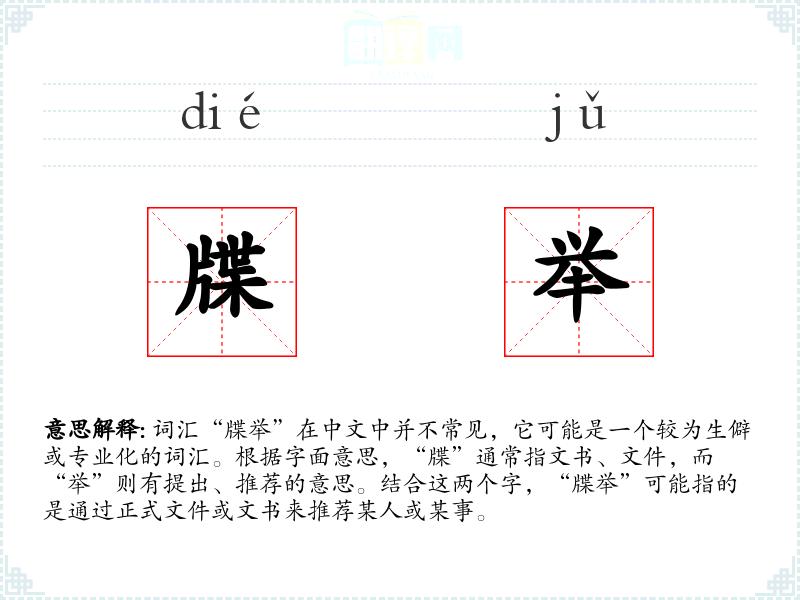 词汇“牒举”在中文中并不常见,它可能是一个较为生僻或专业化的词汇。根据字面意思,“牒”通常指文书、文件,而“举”则有提出、推荐的意思。结合这两个字,“牒举”可能指的是通过正式文件或文书来推荐某人或某事。