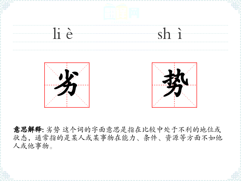 劣势 这个词的字面意思是指在比较中处于不利的地位或状态,通常指的是某人或某事物在能力、条件、资源等方面不如他人或他事物。