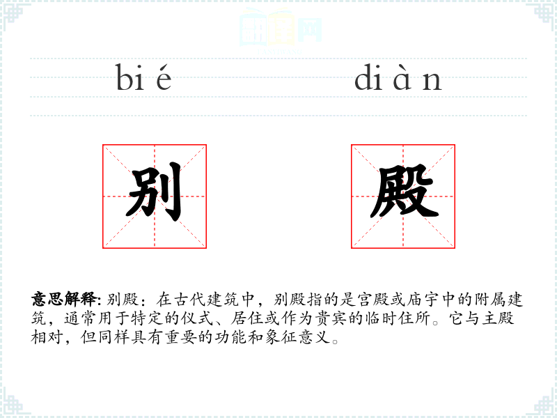 别殿一词不仅是古代建筑的一个组成部分,也是文化和历史的载体。通过对别殿的学,我更加深刻地理解了古代社会的结构和文化传统,这对于我的语言学和文化素养的提升具有重要意义。