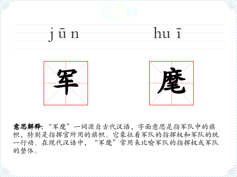 “军麾”一词的词源可以追溯到古代汉语,最初是指军队中的旗帜。随着时间的推移,它的含义逐渐扩展,成为象征军队指挥权和统一行动的词汇。