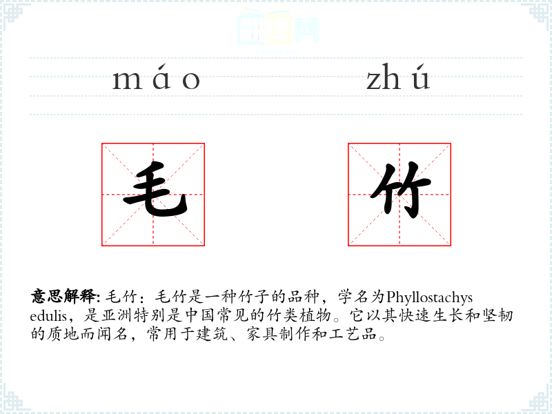 - 口语:在日常对话中,毛竹可能被提及作为建筑材料或园艺植物,例如“我们家的篱笆是用毛竹做的,非常坚固。”