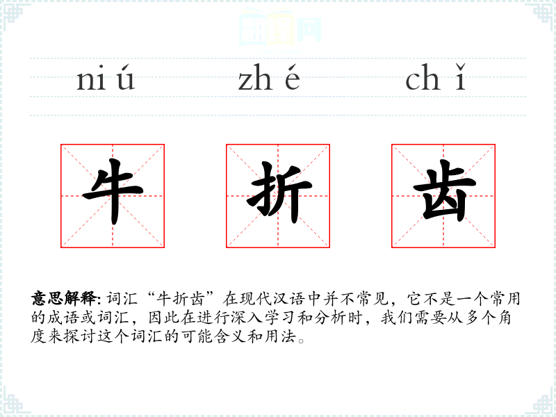词汇“牛折齿”在现代汉语中并不常见,它不是一个常用的成语或词汇,因此在进行深入学*和分析时,我们需要从多个角度来探讨这个词汇的可能含义和用法。