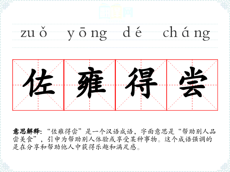 “佐雍得尝”是一个汉语成语,字面意思是“帮助别人品尝美食”,引申为帮助别人体验或享受某种事物。这个成语强调的是在分享和帮助他人中获得乐趣和满足感。