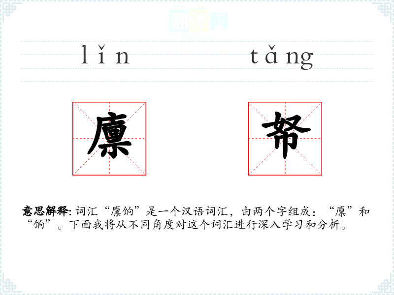 词汇“廪饷”是一个汉语词汇,由两个字组成:“廪”和“饷”。下面我将从不同角度对这个词汇进行深入学*和分析。