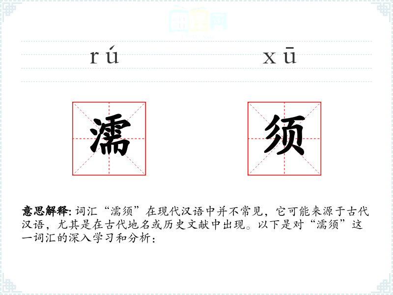 词汇“濡须”在现代汉语中并不常见,它可能来源于古代汉语,尤其是在古代地名或历史文献中出现。以下是对“濡须”这一词汇的深入学习和分析: