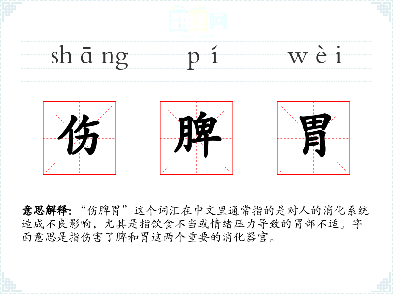 “伤脾胃”这个词汇在中文里通常指的是对人的消化系统造成不良影响,尤其是指饮食不当或情绪压力导致的胃部不适。字面意思是指伤害了脾和胃这两个重要的消化器官。