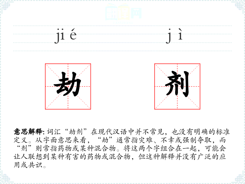 由于“劫剂”不是一个标准词汇,我们无法提供一个确切的基本定义。它可能被某些特定领域或文学作品中创造性地使用,但在日常语言中并不常见。