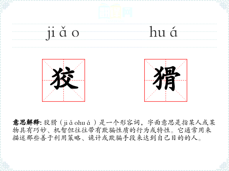 狡猾(jiǎohuá)是一个形容词,字面意思是指某人或某物具有巧妙、机智但往往带有欺骗性质的行为或特性。它通常用来描述那些善于利用策略、诡计或欺骗手段来达到自己目的的人。