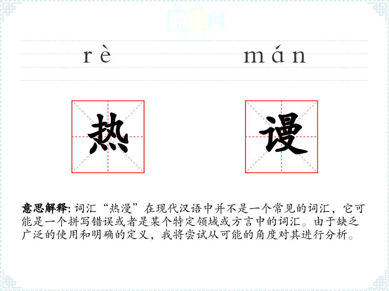 由于“热漫”不是一个标准词汇,我们无法给出一个确切的字面意思和基本含义。它可能是“热”和“漫”两个字的组合,但这种组合在标准汉语中没有明确的意义。
