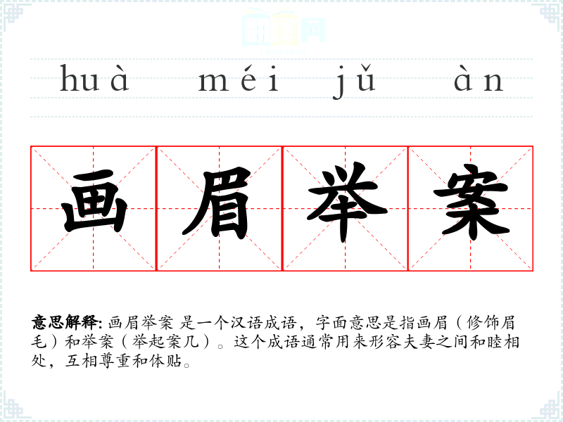 画眉举案 是一个汉语成语,字面意思是指画眉(修饰眉毛)和举案(举起案几)。这个成语通常用来形容夫妻之间和睦相处,互相尊重和体贴。
