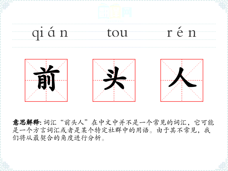 由于“前头人”不是一个常见词汇,个人应用可能较少,但在某些特定的社交场合或方言环境中,可能会遇到这个词的使用。