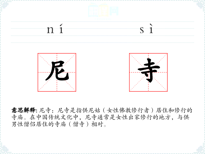 词源:尼寺一词源于汉语,“尼”指女性**修行者,“寺”指寺庙。