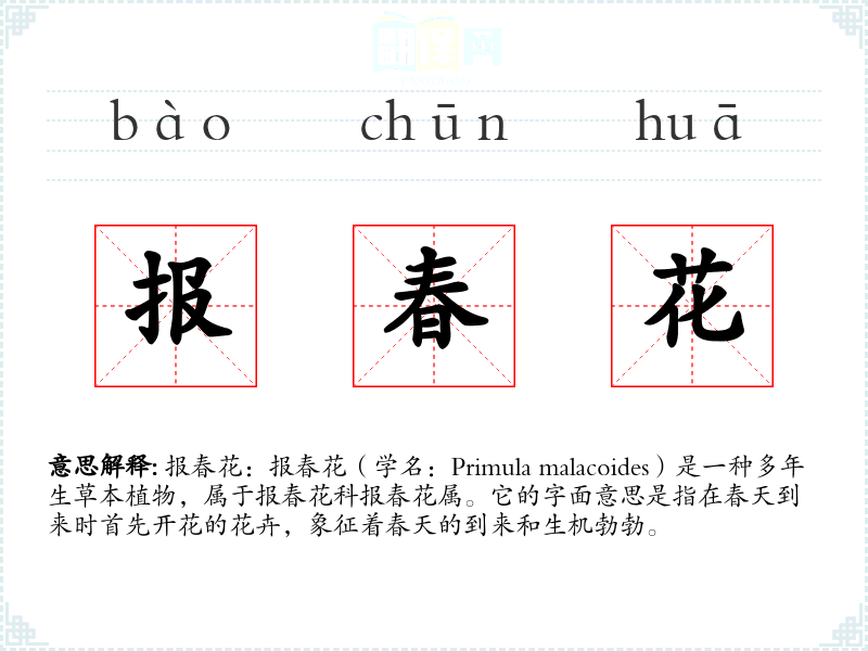 反义词:秋花、冬花(这些词汇与报春花形成季节上的对比,代表不同的季节和花卉)